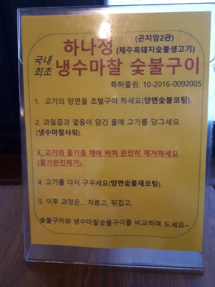 벽면에도 냉수마찰숯불구이가 특허출원까지 했다고 광고를 ㅋㅋㅋ 그런데 주문받으시는 이모님이 "냉수마찰숯불구이 2인분 주세요~" "푸핫~"하면서 웃으시네요 -_-;; 하긴 고기가 뭔 냉수마찰이여.....