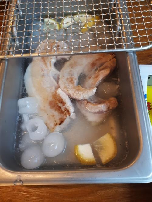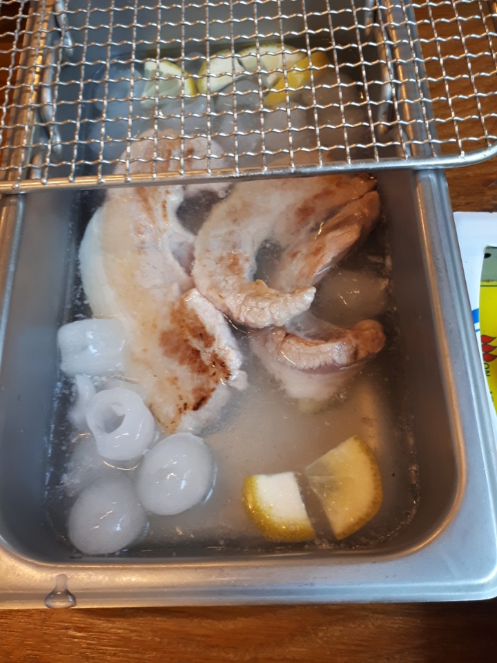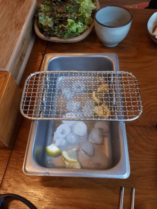 곧 이어 이렇게 레몬조각이 들어있는 얼음물이 나오네요~ 전부 냉수마찰을 시키지 말고 일부는 그냥 구워서 맛의 차이가 어떻게 있을찌 비교해보기로 합니다.ㅋ