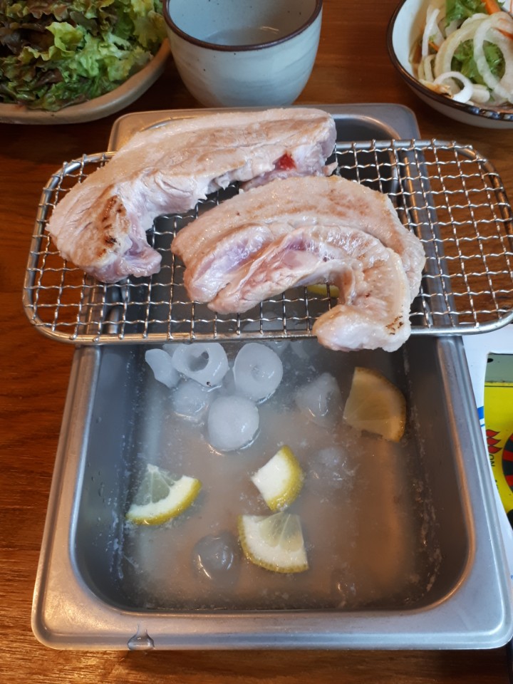 개인적으로 냉수마찰을 괜히 했다고 후회를....-_-;;;; 그냥 익힌 고기는 제 기대대로 담백하면서 고소한 맛있는 삼겹살인데 반해, 냉수마찰시킨 고기는 식감은 부드럽고 좋으나 너무 느끼합니다. 맛.없.어.요!!!ㅋ