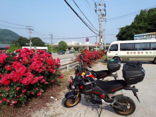 예쁜 장미꽃이 한다발~ 피어있는 앞에 엠엑이들을 나란히 주차~ 가까운 거리에는 탑박스가있는 원동기가 최고죠^^