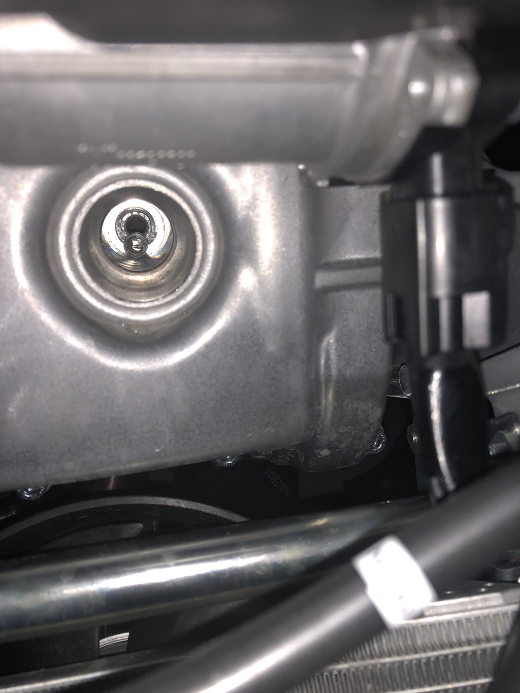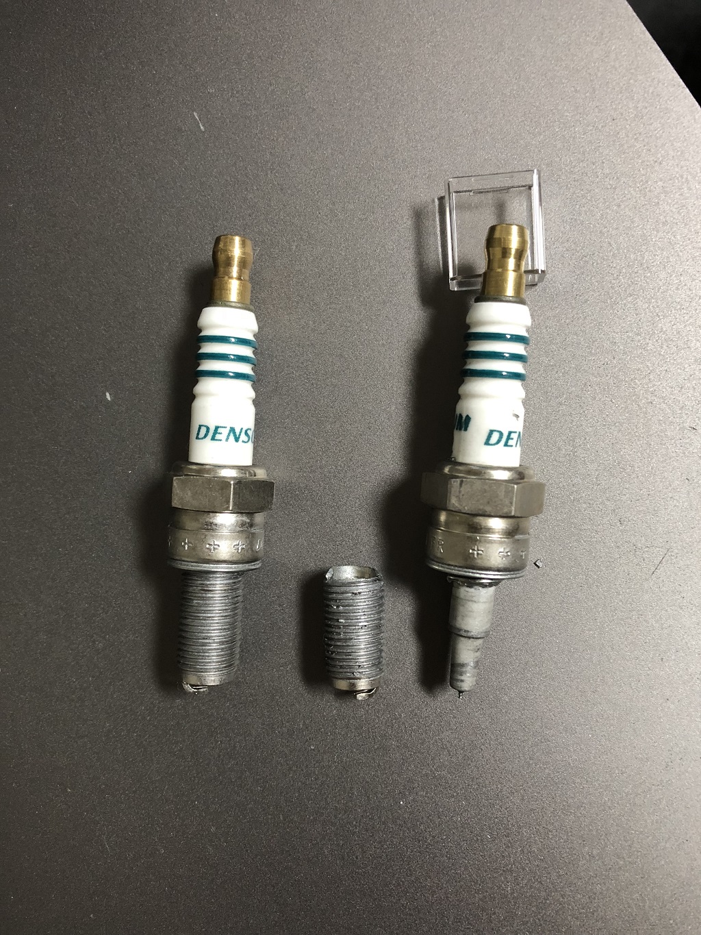 티맥스 기존 플러그를 빼내고 덴소 이리듐으로 교체하다가 두번쨰 플러그가 이상해서 다시 빼는중 계속 헛돌길래 이느낌은 뭐지하면서 플러그를 빼보니 첫번째 사진 우측처럼 나사산부분이 없이 몸체만 쑥 빠지는 겁니다...좌측은 정상