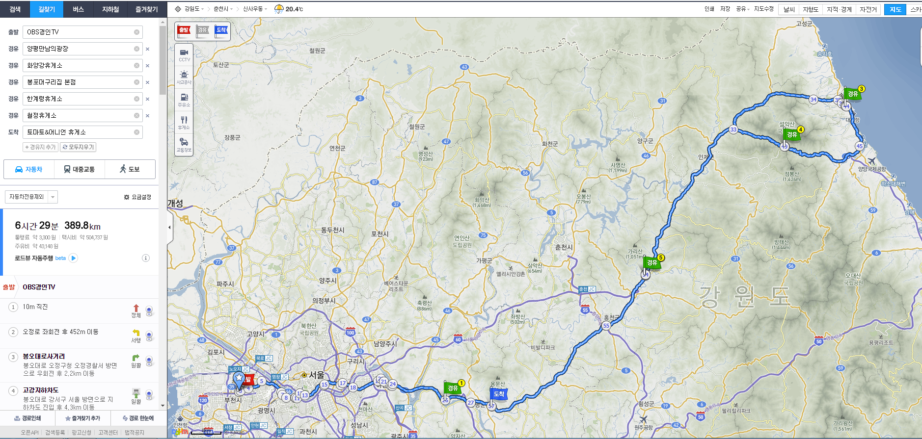 7. 토마토앤어니언 휴게소 -> OBS 방송국 (2시간, 80km)