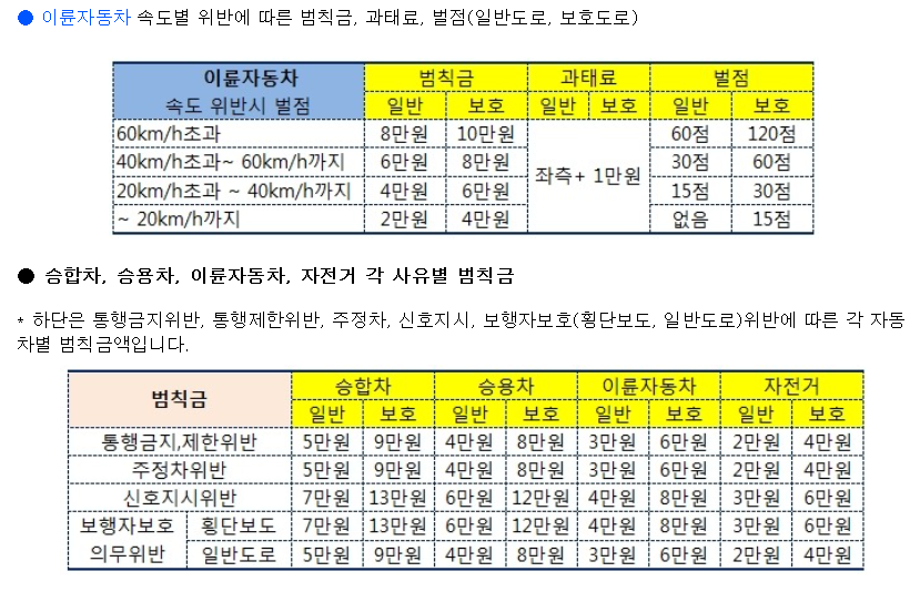 표에서 보호는 어린이 ,장애인,노인보호구역에서의 위반 일때 두배의 벌점을 먹이내요.