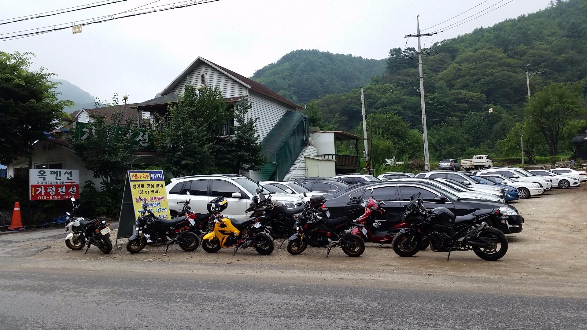 어제 자동차들이 길게 줄지어 있어서 즉흥적으로 길가에 있는 식당으로 들어갔습니다. 다행히 주차장이 있어서 바이크 8대 주차시킬 수 있었어요.^^