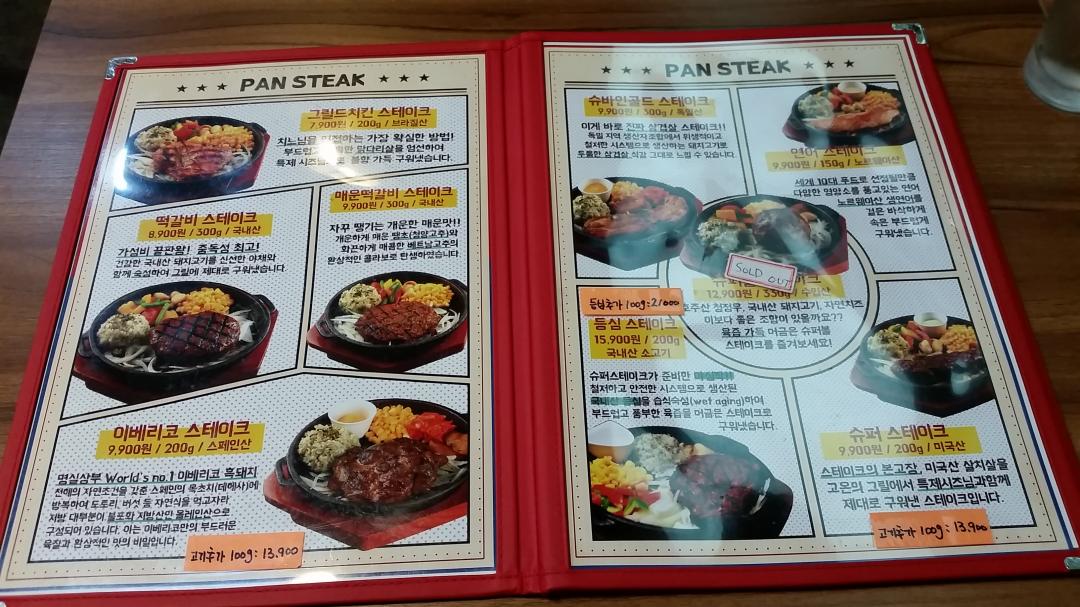 메뉴는 여러종류의 스테이크가 7900원~15900원 있었고 흔히 일반적으로 등심으로 만드는 스테이크는 15900원이었고 다른메뉴는 삼겹살 살치살 치킨 등으로 달랐습니다~