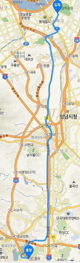 용인흥덕중학교를 기준으로 송파구 방이중학교 까지 루트는 아래와 같습니다.