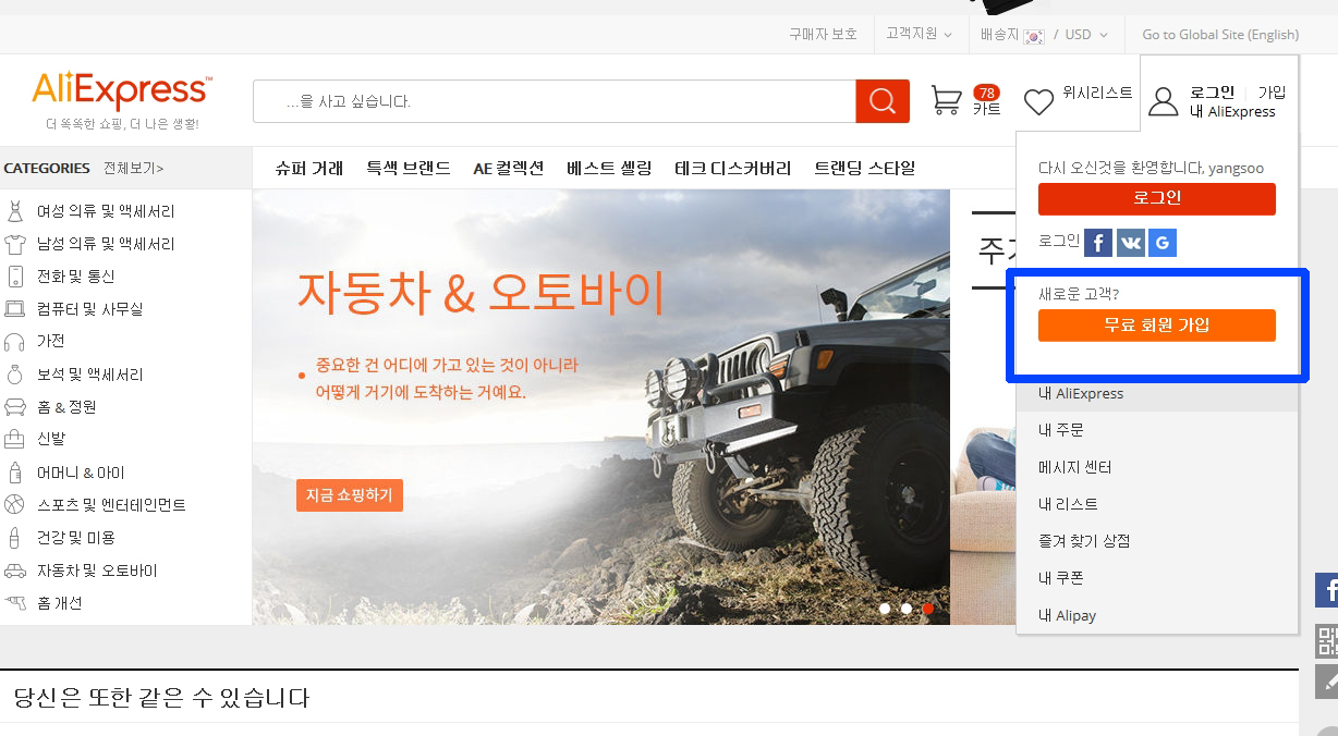 한글이니 누구나 쉽게 따라할 수 있지만 우측 위에 로그인쪽으로 마우스를 가져다 대면