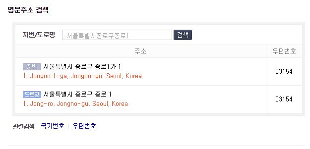 Jong-ro, Jongno-gu, Seoul, Korea 로 도로명 영문 주소가 나옵니다