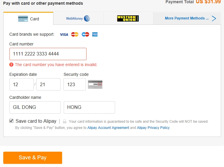 위 부분에서 Save card to Alipay 가 체크된 상태에서