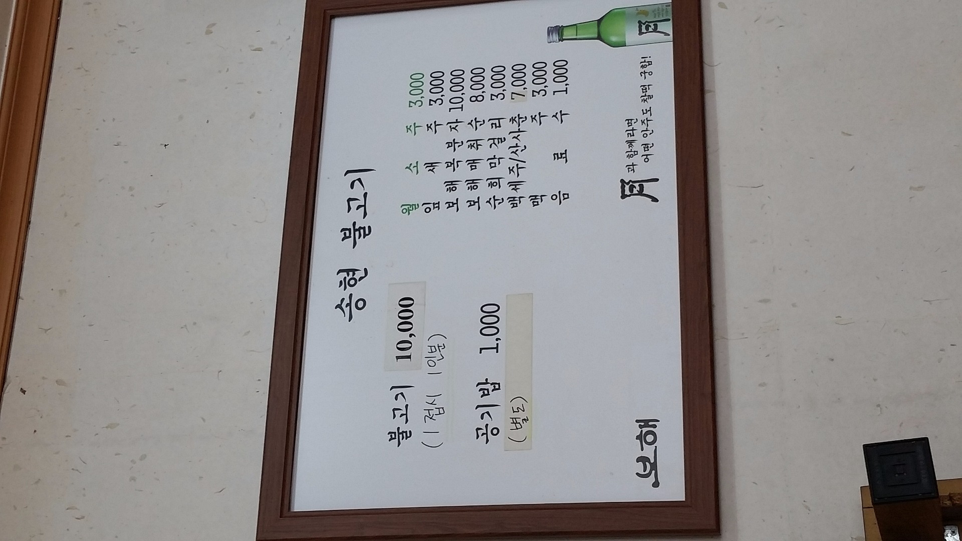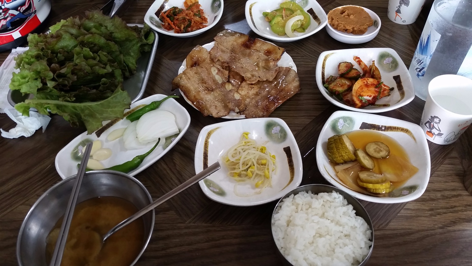 음식이나오는데 첫인상은 제가 싫어하는 비계와 살짝 덜구어진듯한느낌(개인적으로 돼지고기는 바짝굽고 특히 비계부분은 거의 딱딱하게 익혀먹습니다~물론 소고기는 다르죠♡)에 으응?하면서 상추에 고기한점 밥한숟깔 김치 콩나물무침을 언져 한쌈 입에 넣고 씹는순간 오~~~~~~~~맛있습니다♡♡