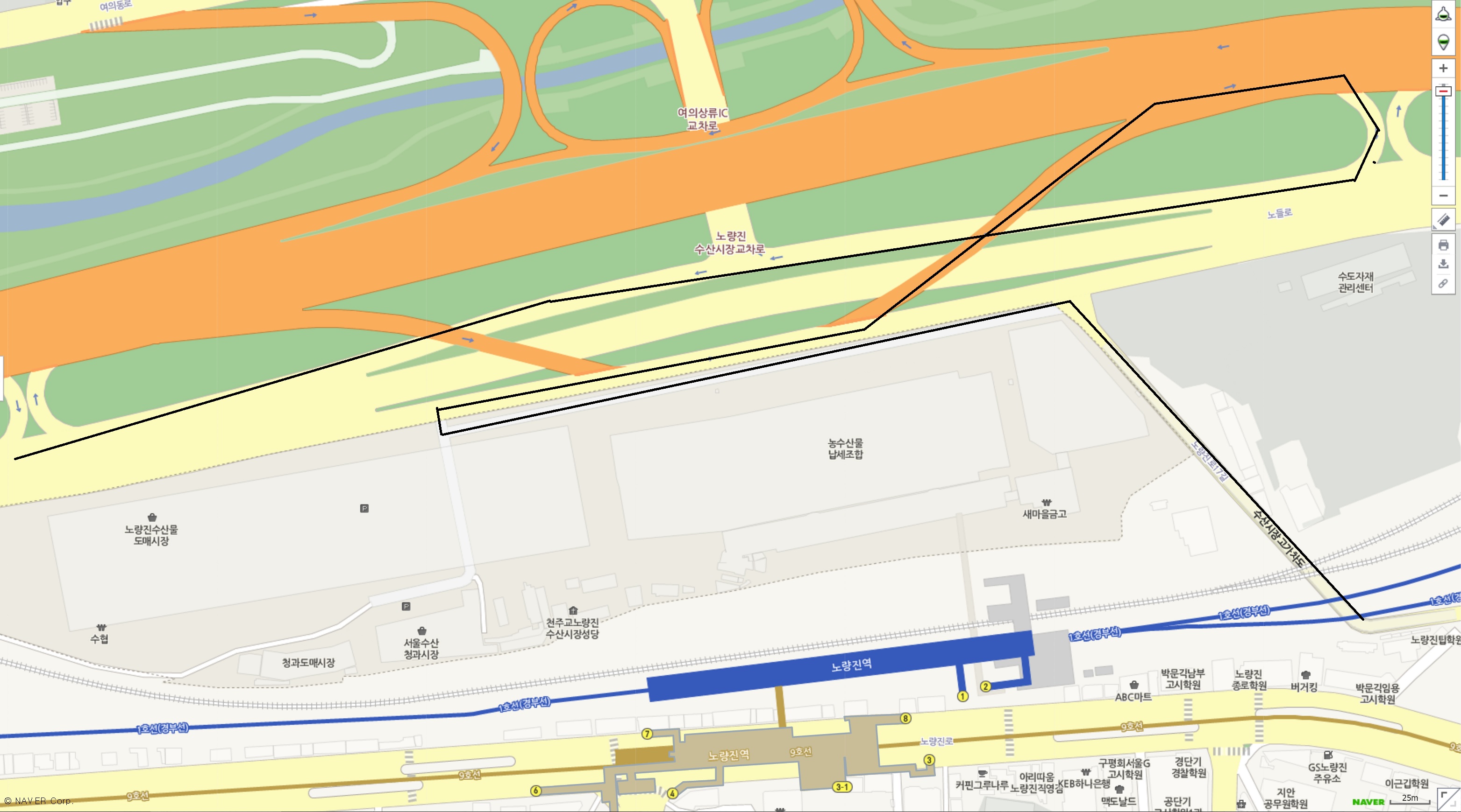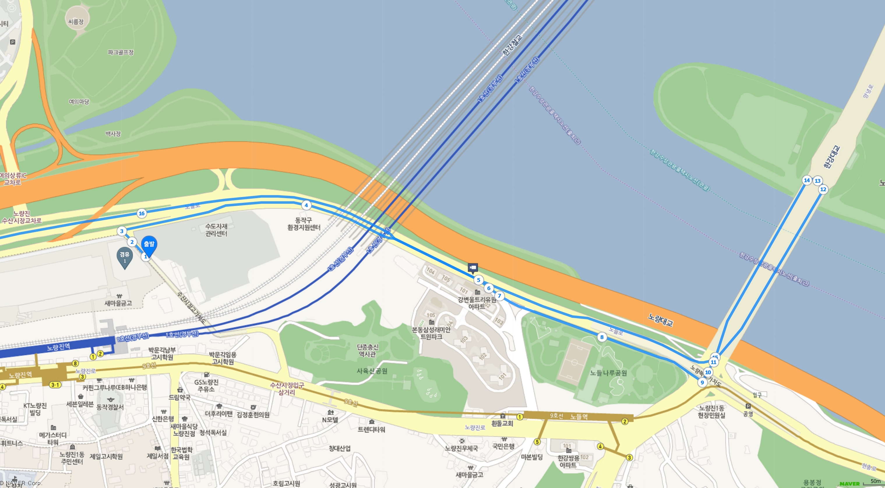1의 방법은 신축 수산시장에서 노들길 동작방향으로 나와서