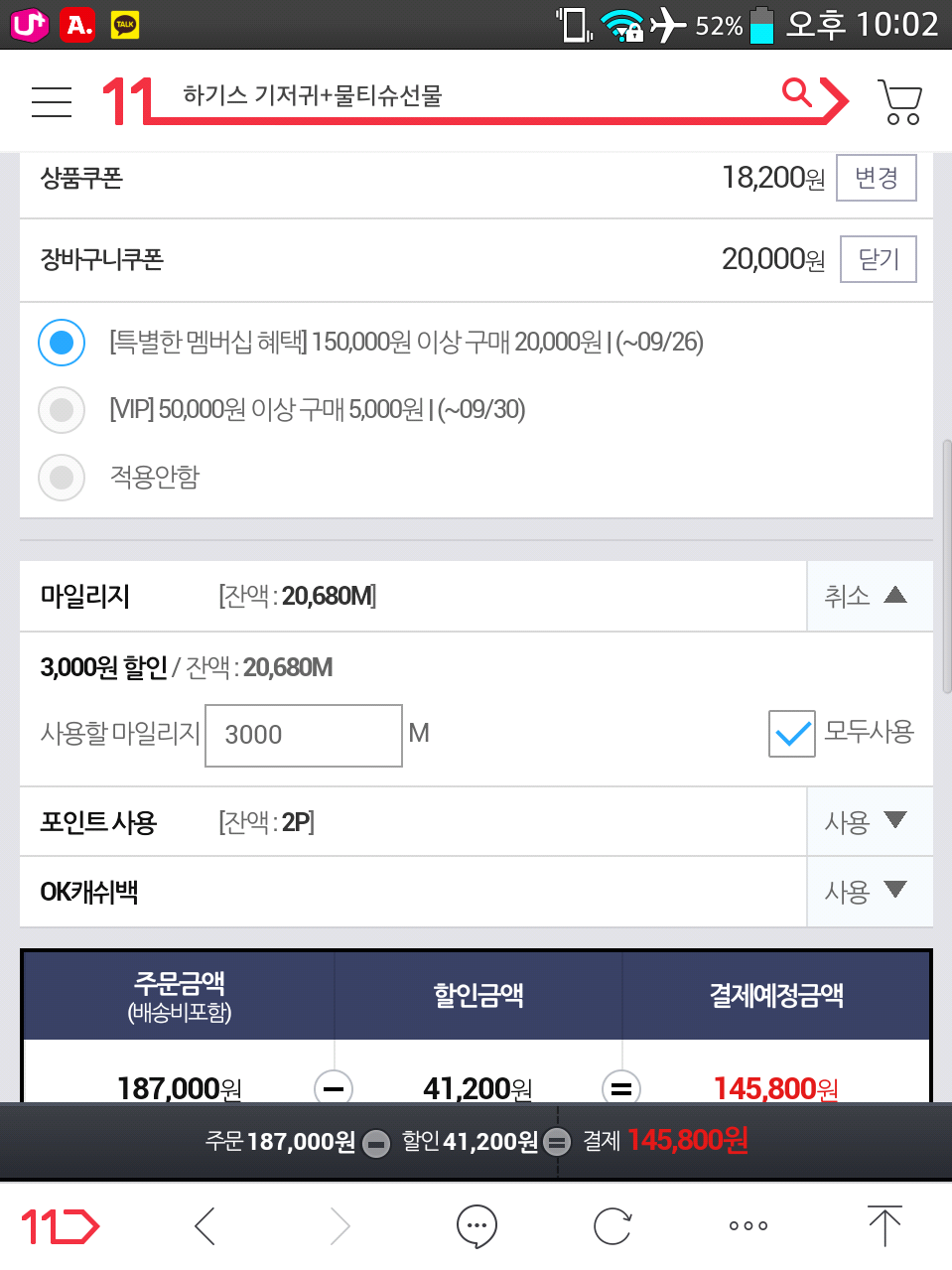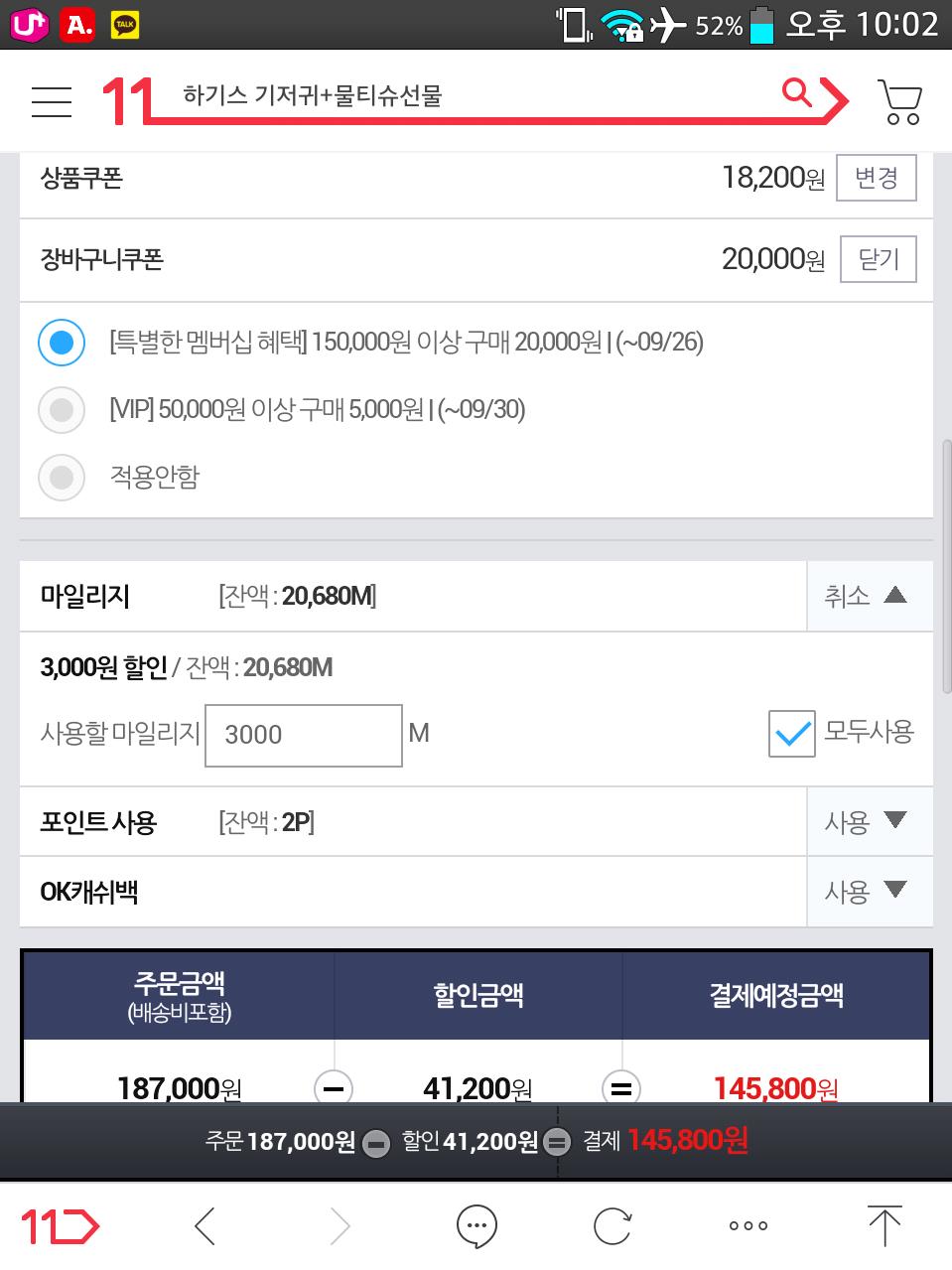 도합 -41,200원 해서 145,800원에 결제했습니다. 오늘 사온 엔맥이에 달린 샤드 39가 생각보다 작더군요. 그래서 방금 네이버에 샤드48 검색해보고 아무생각없이 11번가 들어가니까 하단에 할인쿠폰 팝업창이 뜨네요. 뭐지? 하고 누르니 자전거/레저 15만원이상 15000원 할인 쿠폰을 준대요 헐...... 그래서 다운받고 샤드48 장바구니에 넣고, 폰으로 11번가 앱켜서 할인쿠폰 적용시켜보니 오오+_+... 게다가 언제 받았는지 어디서 생겼는지 모를 2만원 할인쿠폰까지;;;