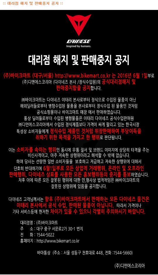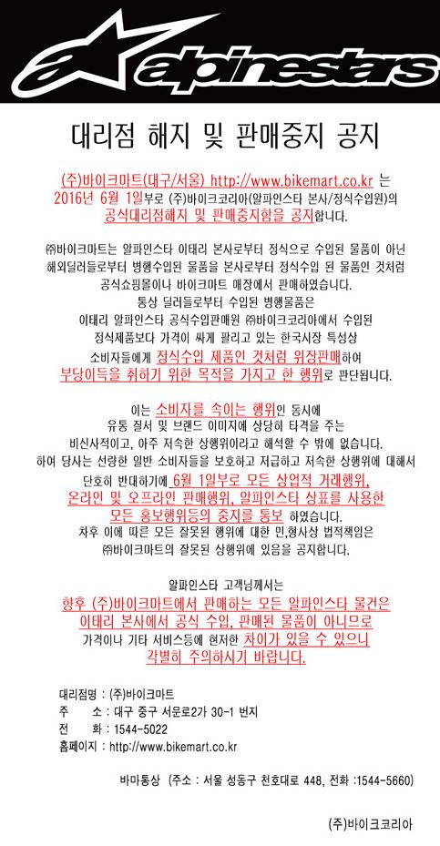 그동안 바이크마트에서 판매되던, 알파인스타, 다이네즈 중 일부 저렴했던 품목이 병행으로 들여왔던 사실이 발각 되었는지 아래와 같은 공지가 떴네요....