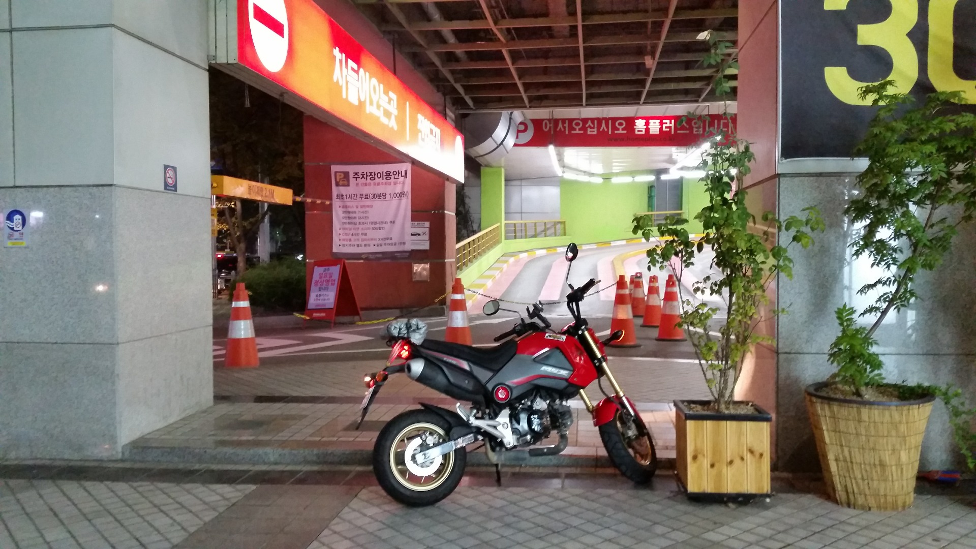 아주 눈에 잘 띄는 곳에 '이륜차 진입금지' 써붙여 놨어요. 홈플러스 입장이라기 보단 전체 건물 주차장에서 막은거 같아요.