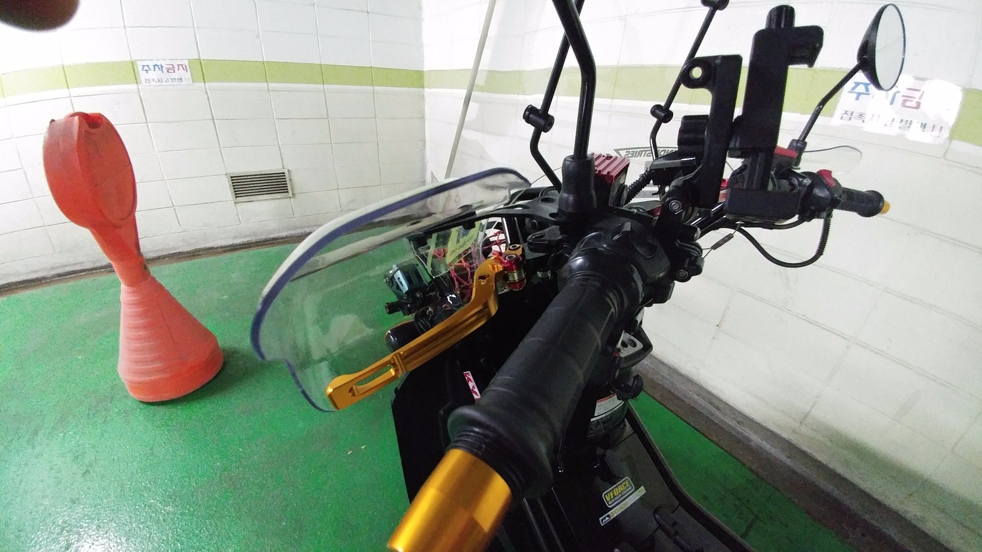 핸들에 고정할 미러자리가 있습니다만 아마 쉴드랑 간섭이 있을거 같습니다 |