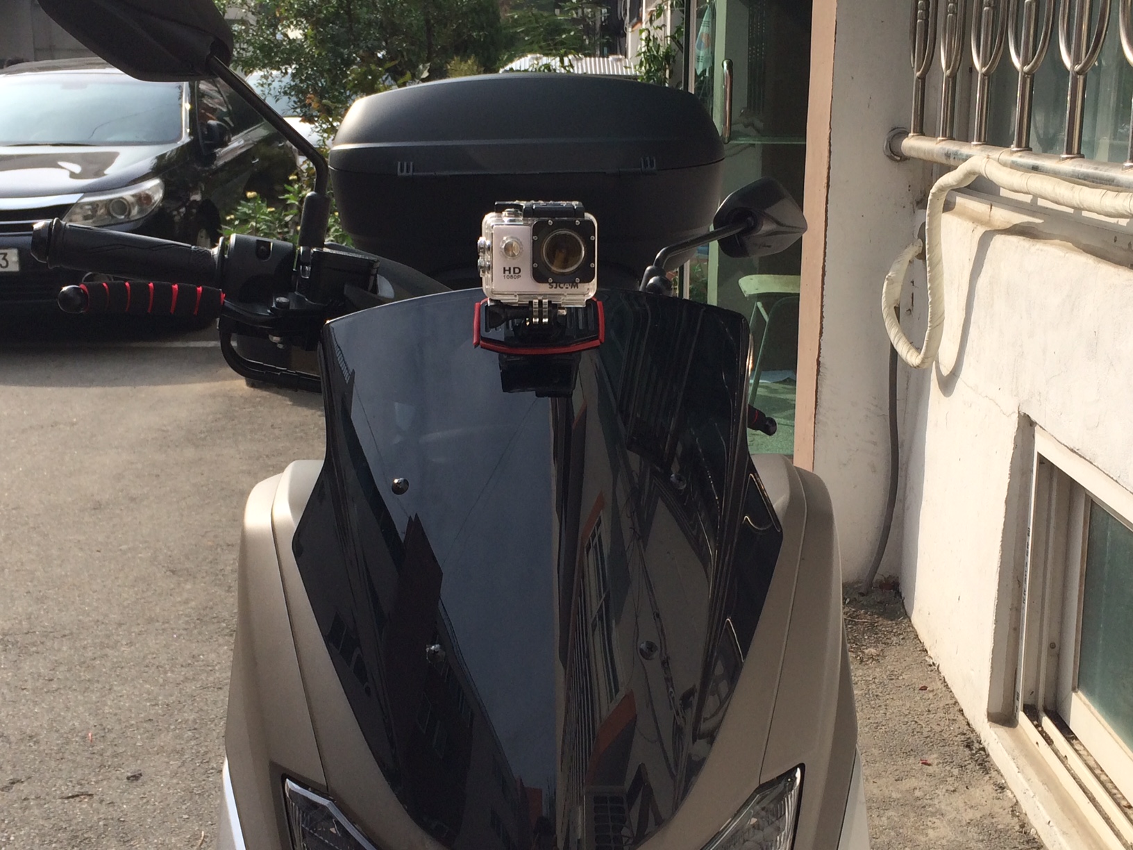 마제스티 탈때는 투명쉴드 안쪽과 계기반 쉴드 사이에 고정해서 영상에 흔들림이 전혀 없었는데, 엔맥스 쉴드 전면에 장착하니 영상이 많이 흔들리더군요 흑... 하지만 원하는 장면에서 멈추면 그 장면은 번호판 식별 가능할 정도의 화질이라 블랙박스로서의 기능에는 지장이 없을 것 같습니다.