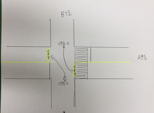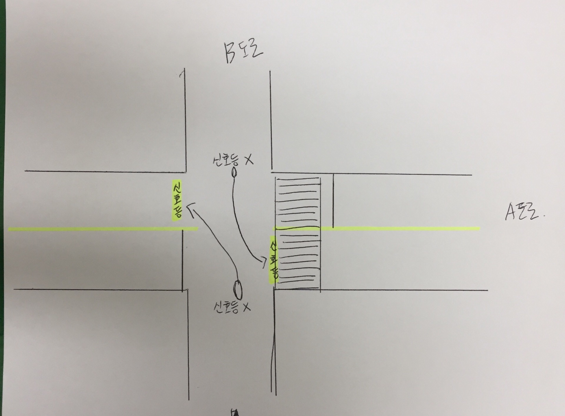 - 이건 사고 내용만 보면 당연한건데요. 다른 부분을 말씀드리려고 예를 들었습니다. 그림처럼 큰 도로로 합류하려는데...이상하게 전방에 신호등이 없네요. 그러면 보통 고민이 됩니다. A도로 신호등이 빨간불이 들어올때 내가 가야되나? 횡단보도 보행자 신호때 내가 가야되나? A도로 초록불인데 내가 가도 되는건가?등등...