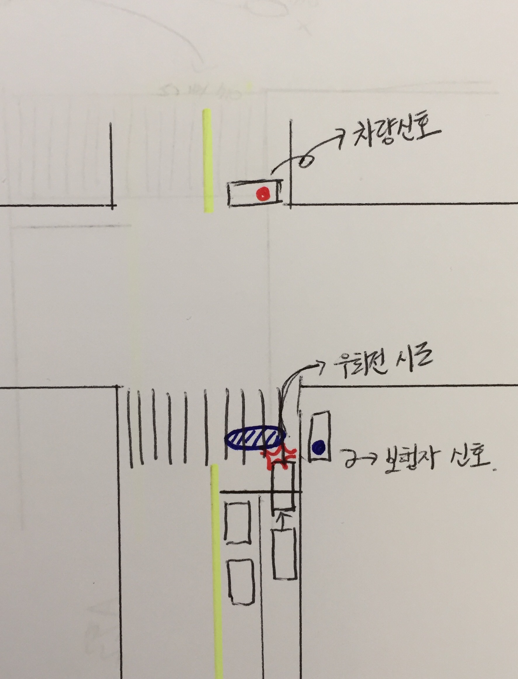 - 상황: 교차로에 위치한 횡단보도에 보행등이 들어오자 인근 상가 볼일을 끝낸 A가 오토바이를 타고 횡단보도를 건넌다. 중간 이상 건널 쯤 우회전하는 차량이 오토바이를 충격(차량신호등은 적색)
