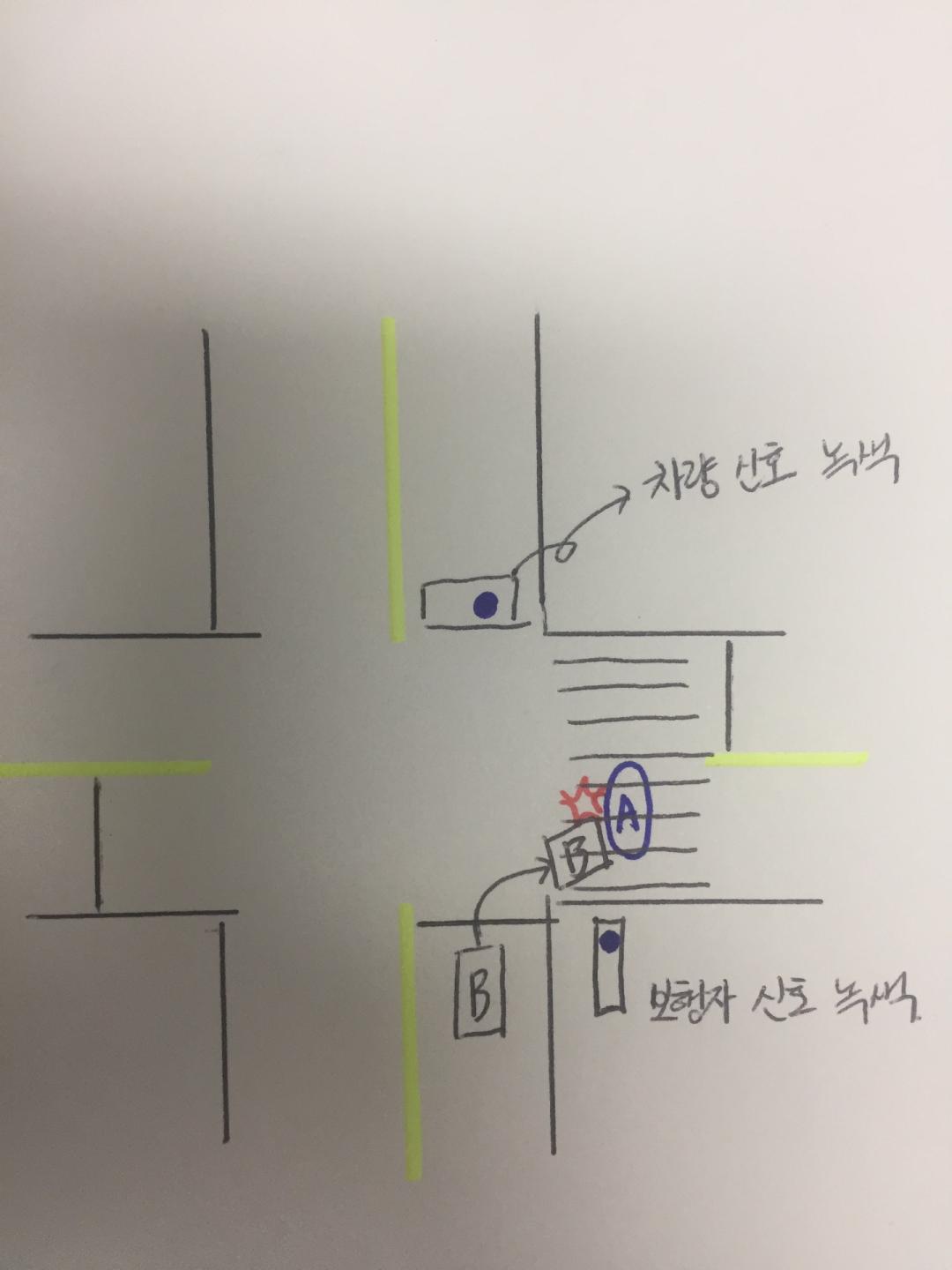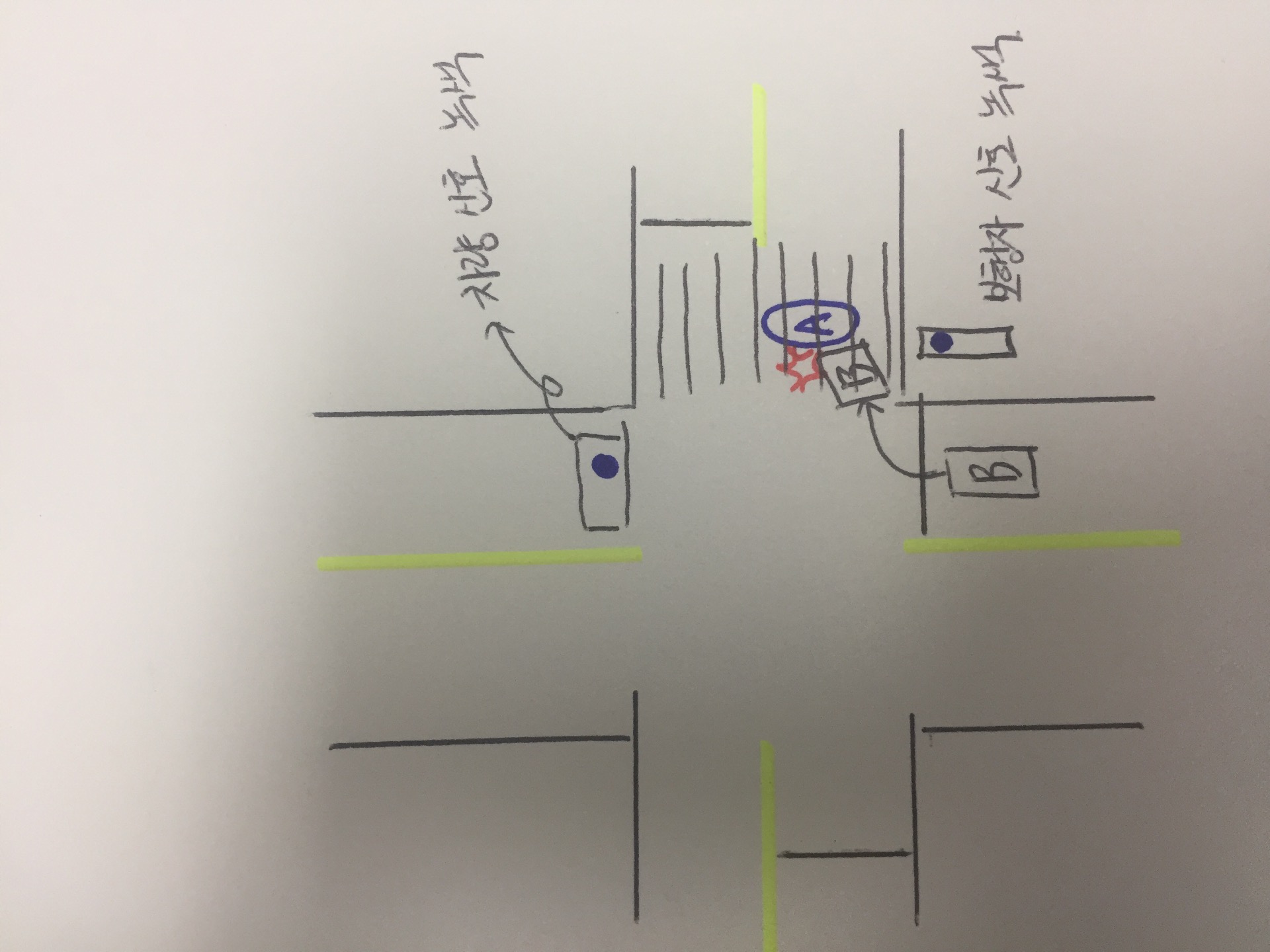 1. 상황: 자동차 운전자 B는 전방 초록불을 확인하고 우회전을 했다. 그러나 우회전 직후 횡단보도를 건너는 보행자A를(오토바이를) 충돌