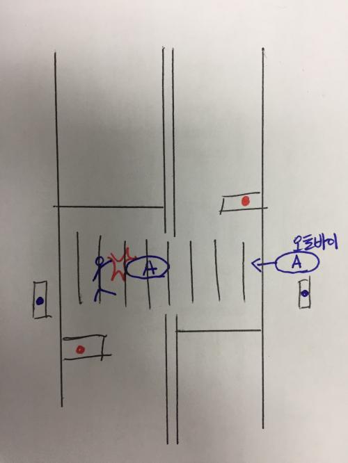 1. 상황: 직진 도로(교차로가 아닌 단일로) 중간에 횡단보도가 있다. 상가 볼일은 마친 오토바이 운전자A는 반대편 상가에 볼일을 보기 위해 부득이 횡단보도를 건넜다. 그러나 중간지점을 지나고 난뒤 보행자를 충돌했다.