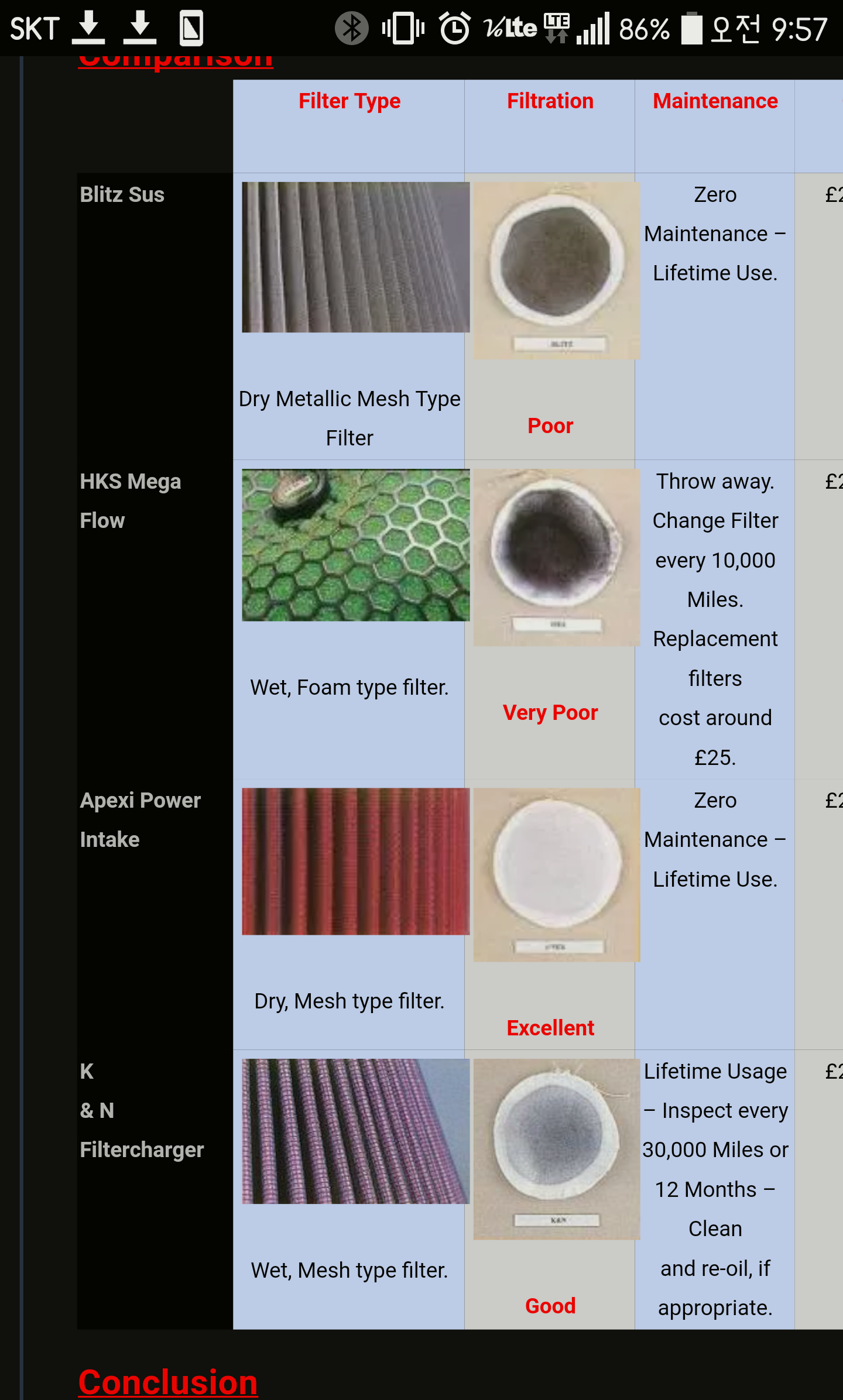 3번째제품이 제일 우수하고 4번째인 k&n도 준수한