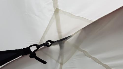 메인폴 3개외에 빨강색상의 사이드폴 2개가 X자로 가로지르며 쉘터의 각을 살려줍니다.