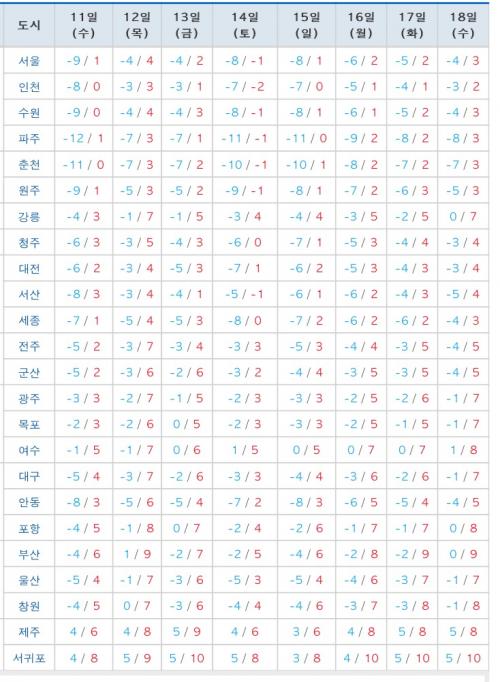 아침부터 비예보가 저녁으로 밀렸고 다음주 월화 눈비 후 수요일부터 주욱 한파가 찾아온다고 합니다.