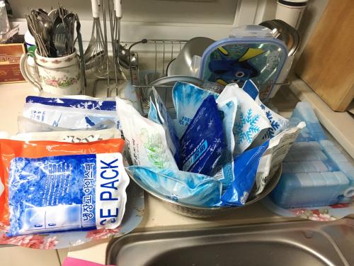 아이스팩들과 쿨러두개의 안밖을 락스물로 세척후 베란다에 건조시키고 있더군요^^