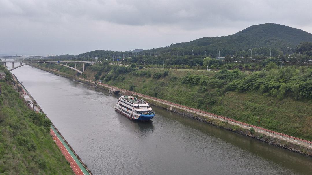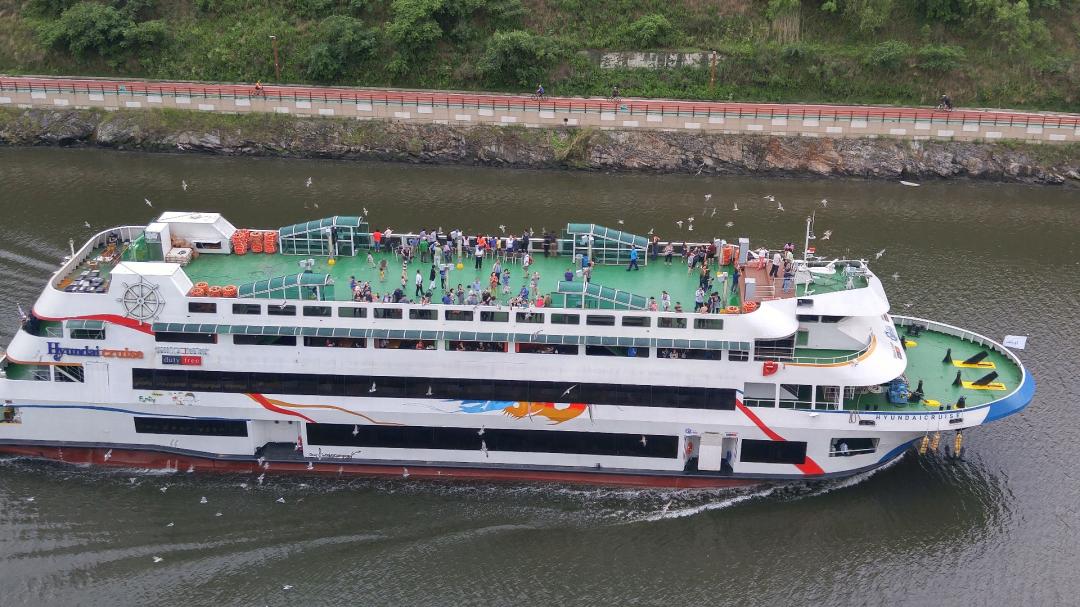 유람선 탄 사람들에게 손도 흔들어주고