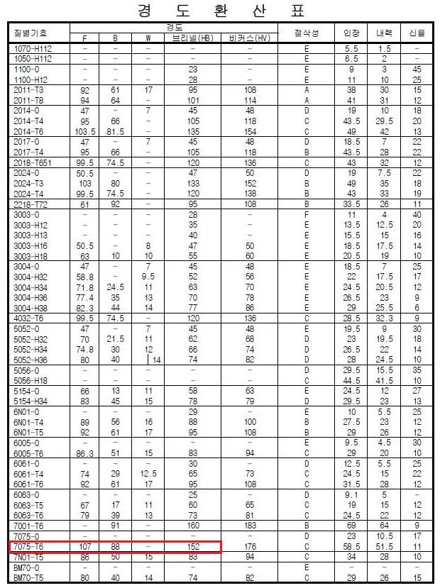 알루미늄(두랄루민)7075 - T6 열처리의 브리넬 경도를 보면 152 라고 나와있습니다.