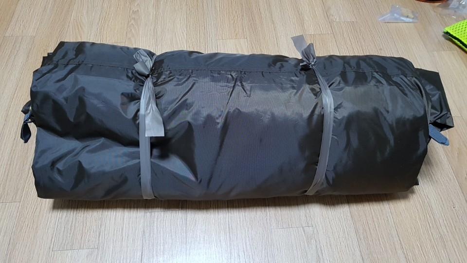 텐트 본체에 플라이랑 폴대, 팩가방이 쌓여있습니다.