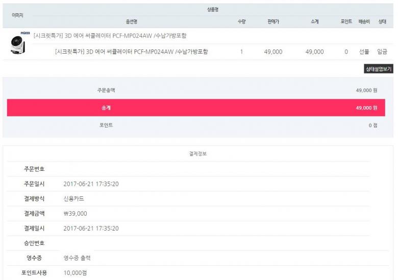 끝 집사람꺼 회사로 보낼까 하다 집으로 보냈는데 동일 주소지로 대량 구매시 취소 한다네요 ㅎㅎㅎ | ||
