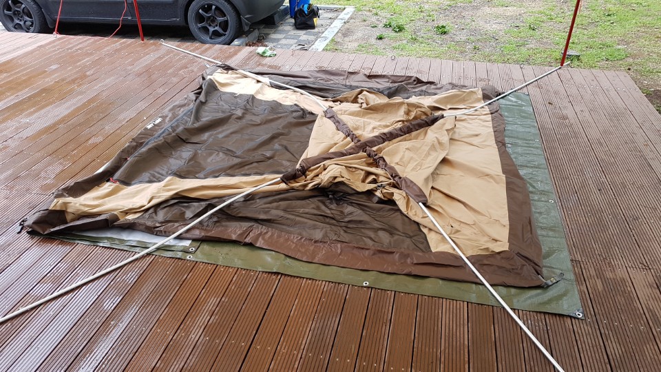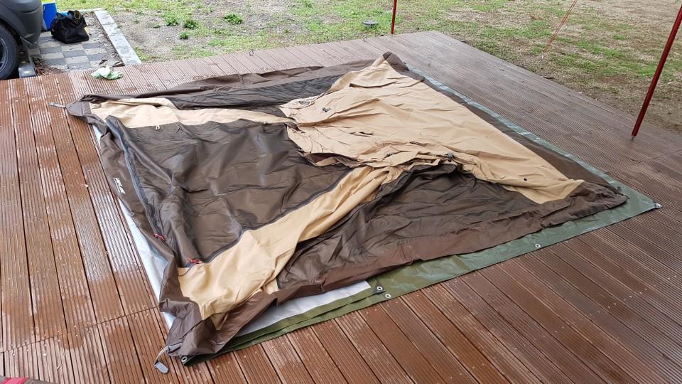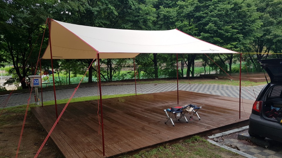 비가 안오는 타이밍에 타프를 후딱 내리고 겉에 생긴 물방울을 닦아줍니다.