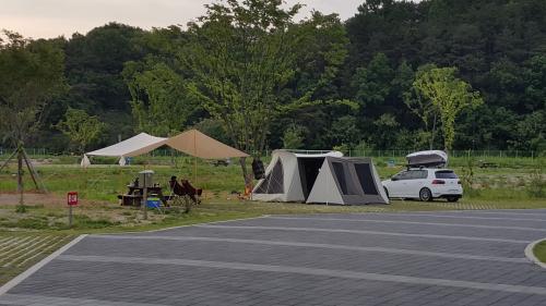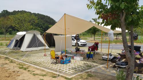말씀하신 사이트는 합강공원 캠핑장인데  대형사이트의 경우 텐트 3동 정도 칠수있고 소형도 2동 정도는 넉넉히 칠수 있습니다