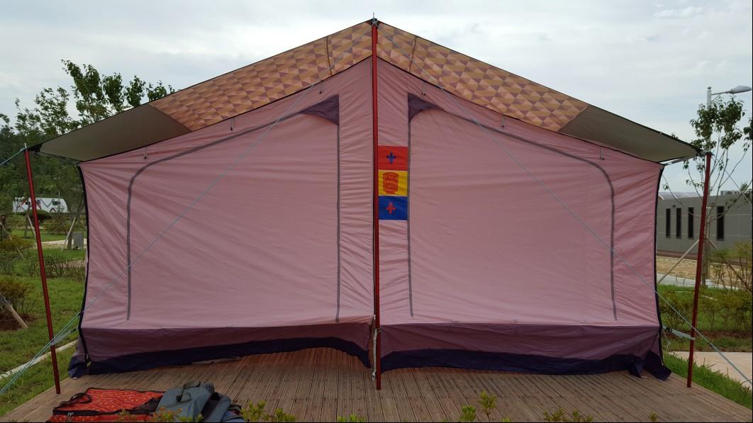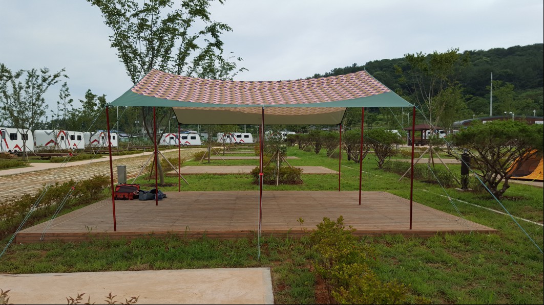 아침 8시에 예약 자리를 확인 후, 장비를 세팅해봅니다. 구성은 네이버 카페(캠핑스탁)에서 구입한 미라벨가든 타프와 스크린을 세팅하고, 그 안에 네파 알토텐트의 이너 조합으로 하였습니다.