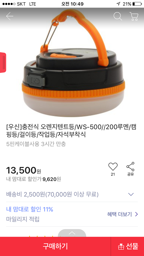 하계용 돔텐트나 그늘막텐트에서 사용하기 딱좋은 렌턴하나 추천드려요(타프용 비추)