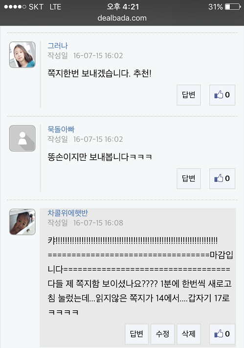 ㅋㅋㅋㅋ 전 엄청 빨리 보낸거군요.. ㅋㅋㅋㅋㅋㅋ 캠포님들 눈치 장난 아니네요~~~~~ 나눔시는분껜 추천을~