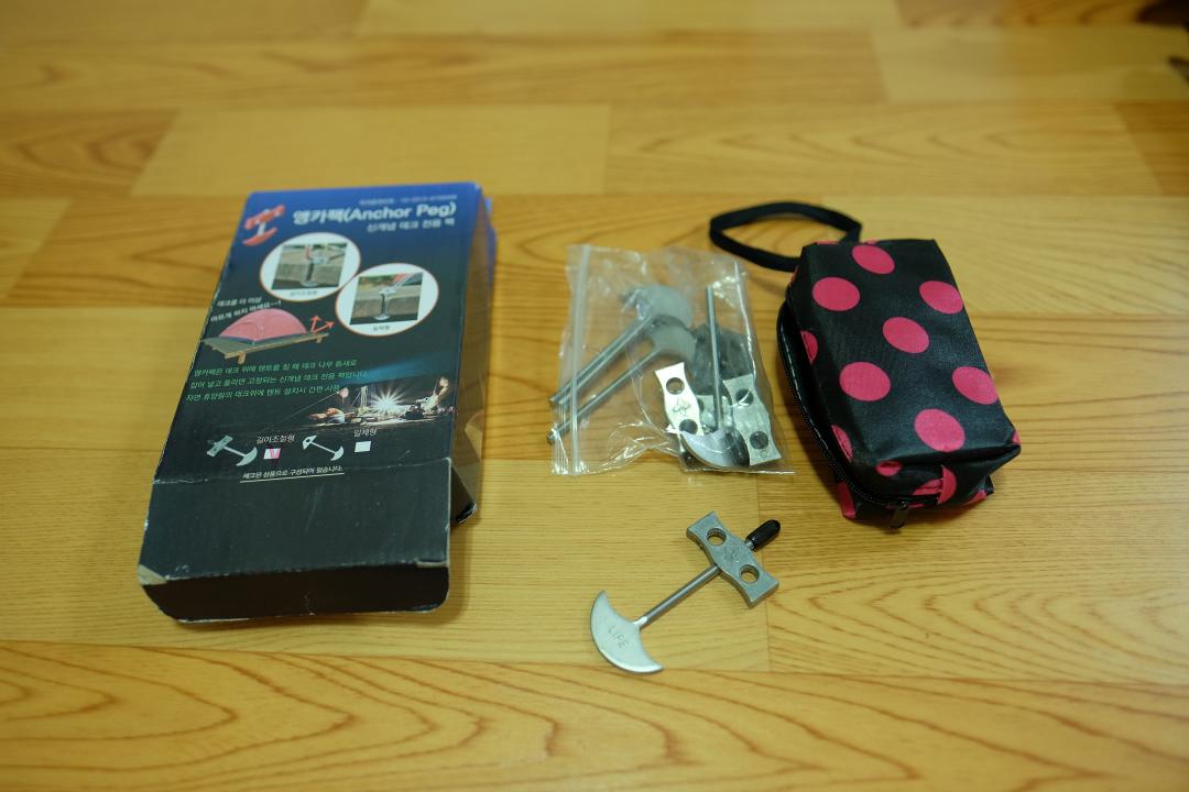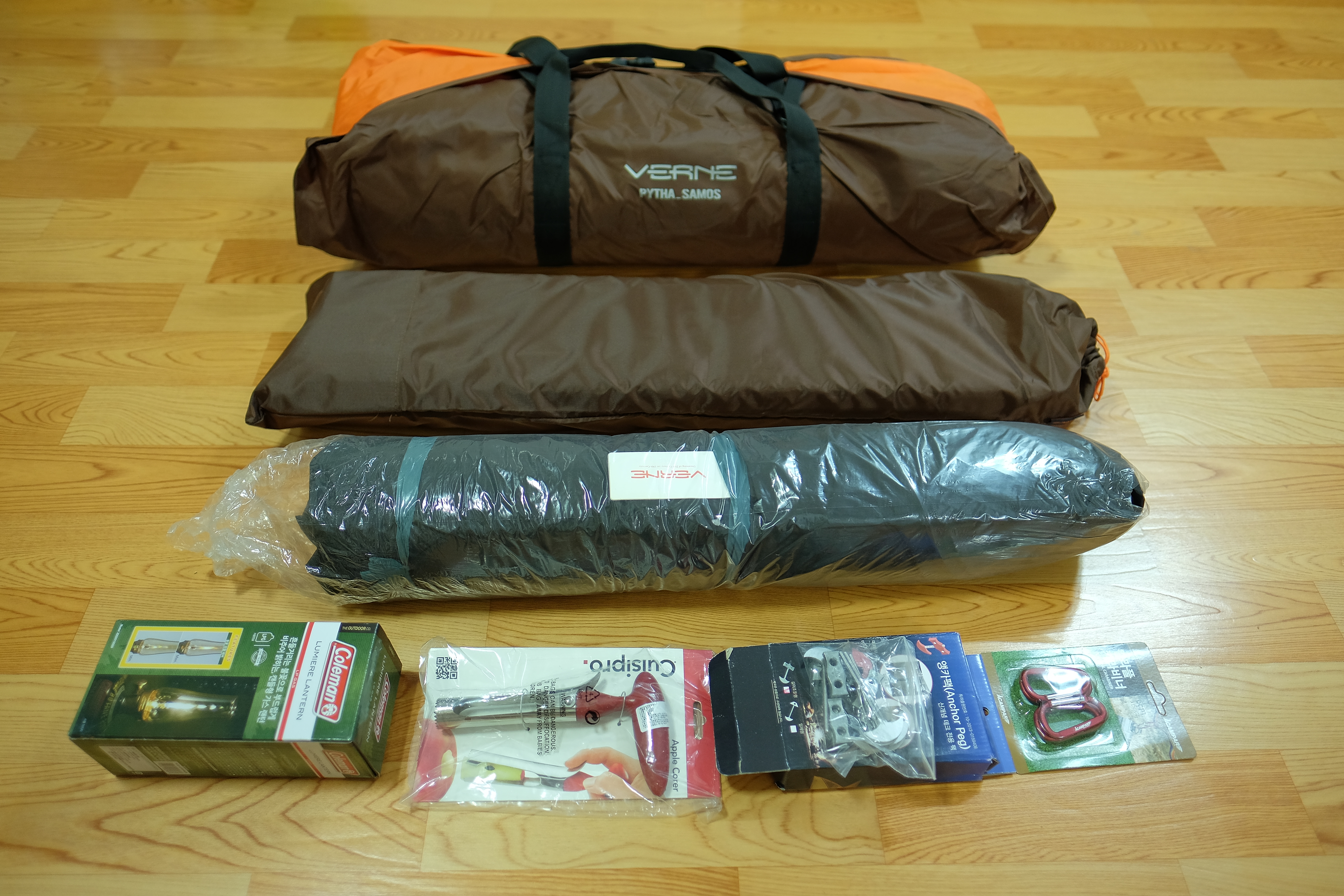 위에서부터 쉘터, 폴대, 추가 이너텐트, 루미에르, 사과 씨발라먹는 기구;;, 데크용 앵카펙, 싸구려 카라비너 입니다