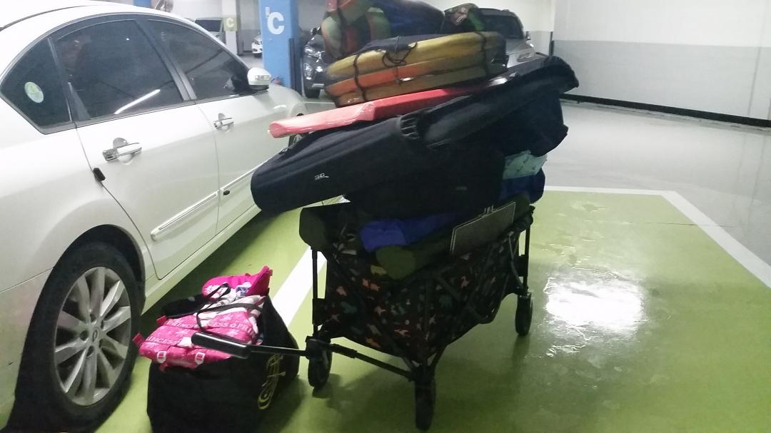 캠핑은 2박이나 먼저 본가로 출발을 위해 캠핑용품과 물놀이 용품을 준비합니다.