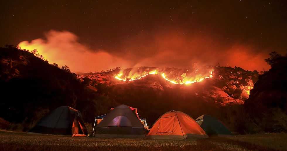 미 캘리포니아주 베리에사호 부근의 나파 카운티와 솔라노의 비탈로에 '콜드 파이어'라 불리는 대형 산불이 서서히 확산되고 있는 가운데 퓨타천에서 밤을 보내기 위해 캠핑객들의 설치한 텐트가 세워져 있다