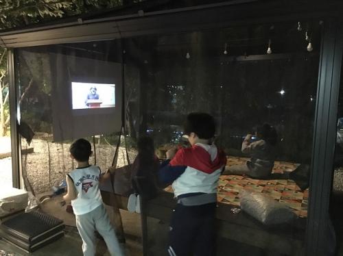 본부석 옆에 자리잡은 메쉬망이 설치된 대청에 아이들을 위한 작은 영화관을 만들어 주었어요^^