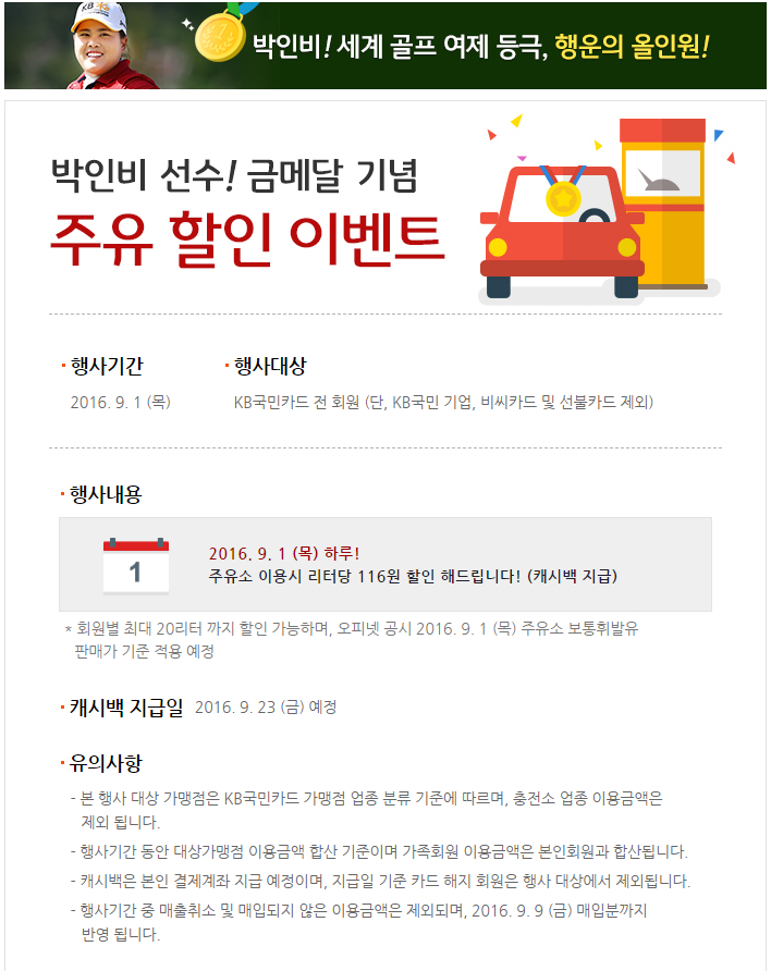 박인비선수 금메달 기념으로 9월1일 하루만 KB국민카드 결제시 리터탕 116원 할인해 준답니다.