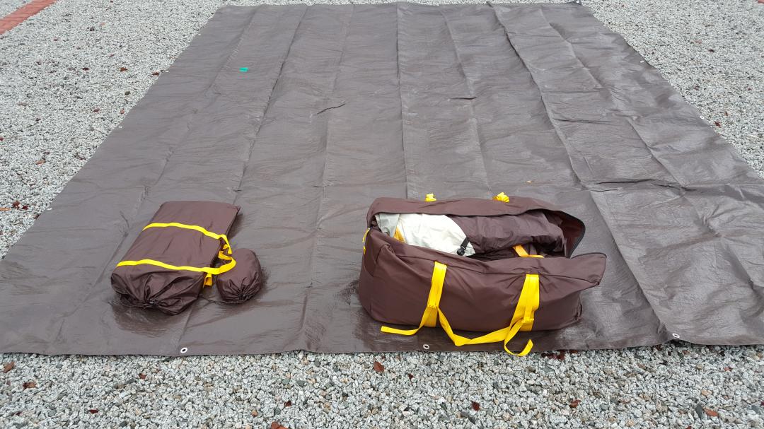 여름에 연습하다 힘들었던 기억은 없고 집사람과 화기애애하게 비를 맞으며 텐트를 칩니다.