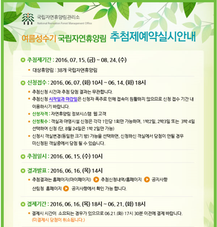 국립자연휴양림 성수기 추첨이 내일(6월14일) 마감입니다.