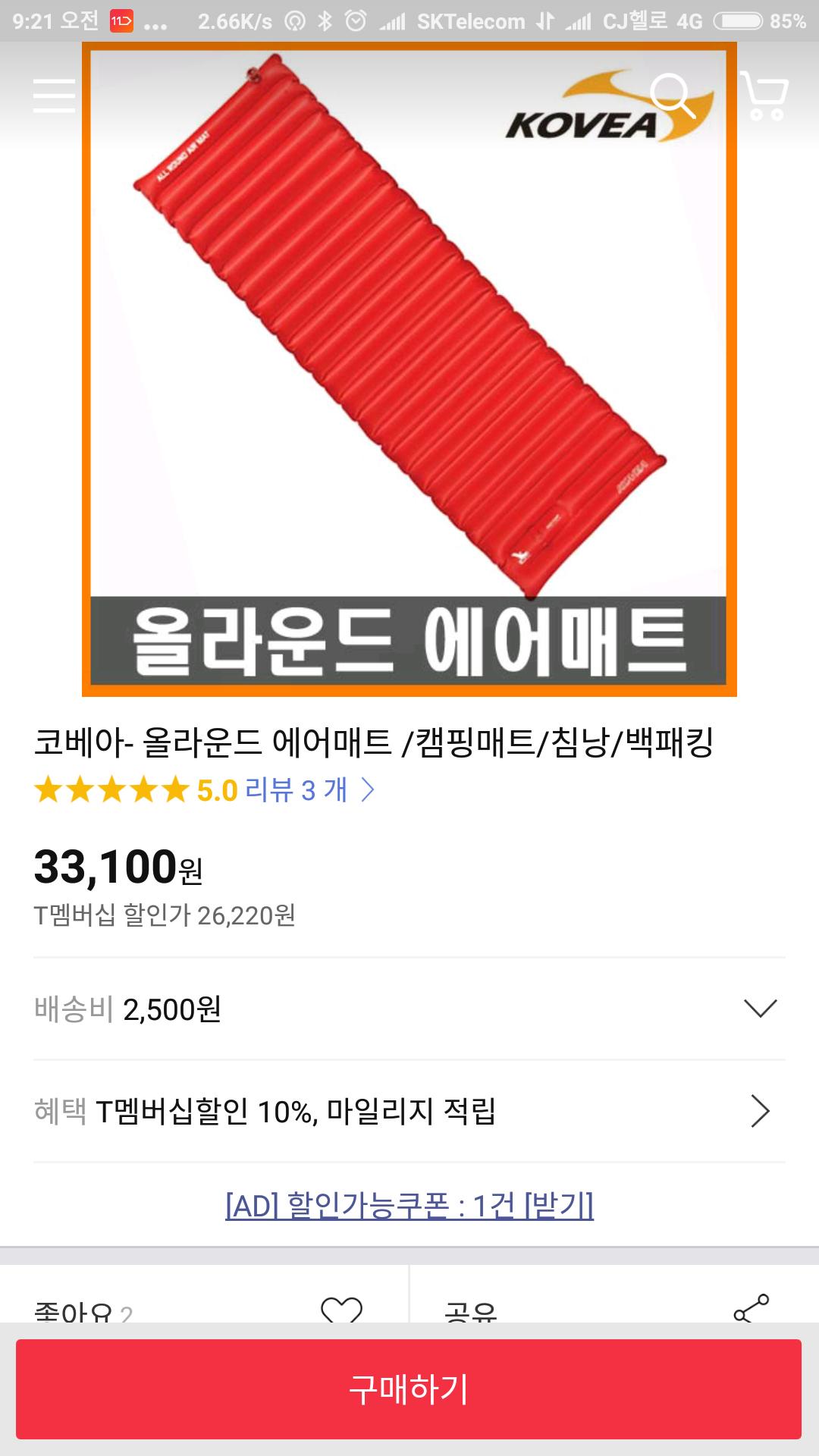 코베아에서 새로나온 미니멀 및 백패킹용 에어매트입니다.