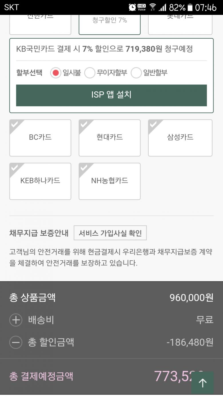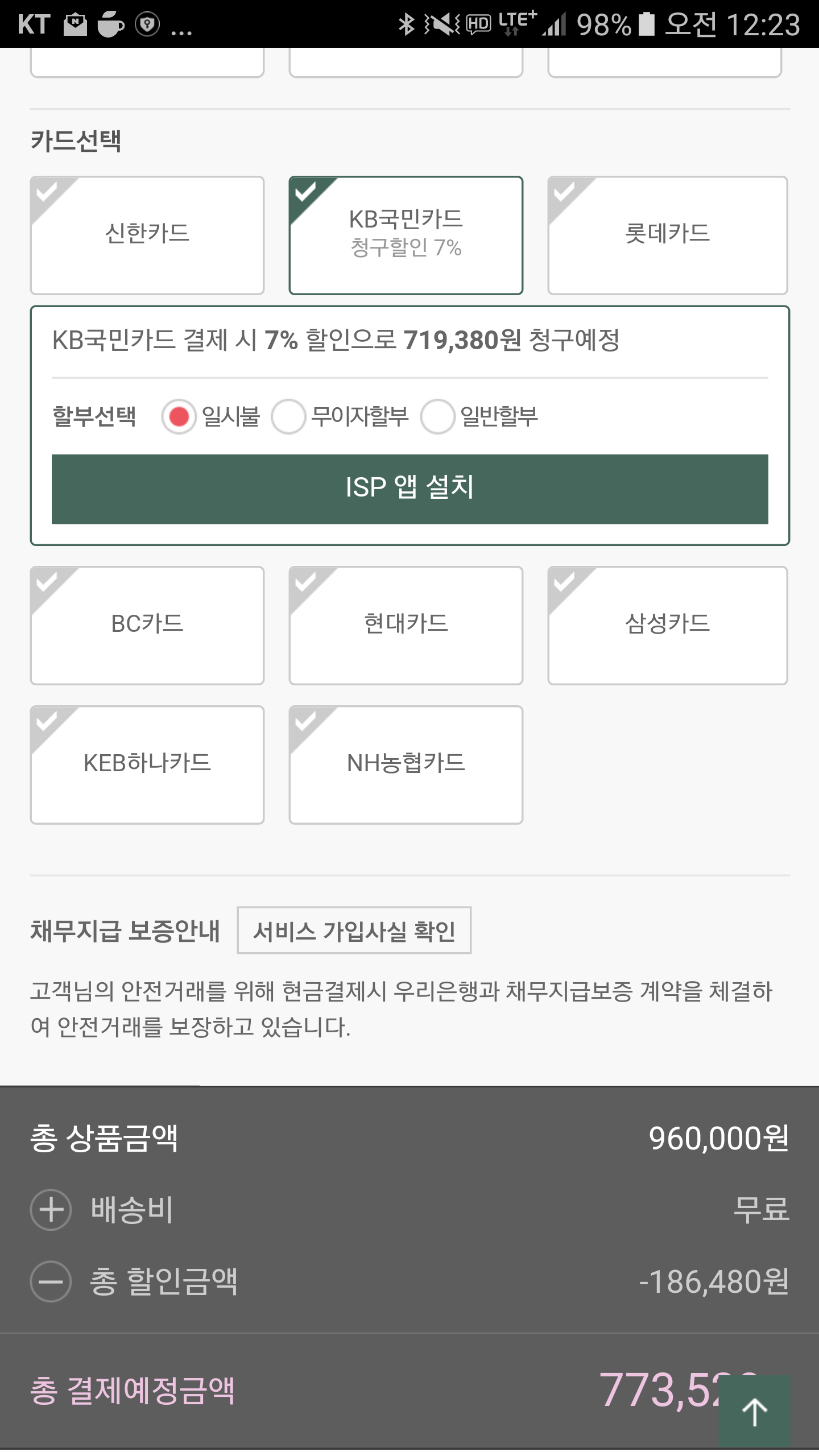 신규가입 5프로쿠폰 kb 7프로 청구할인 포함 719.380원이구