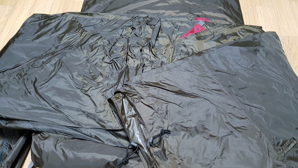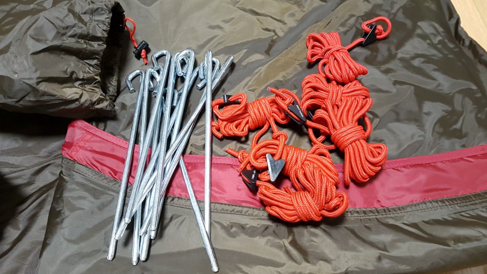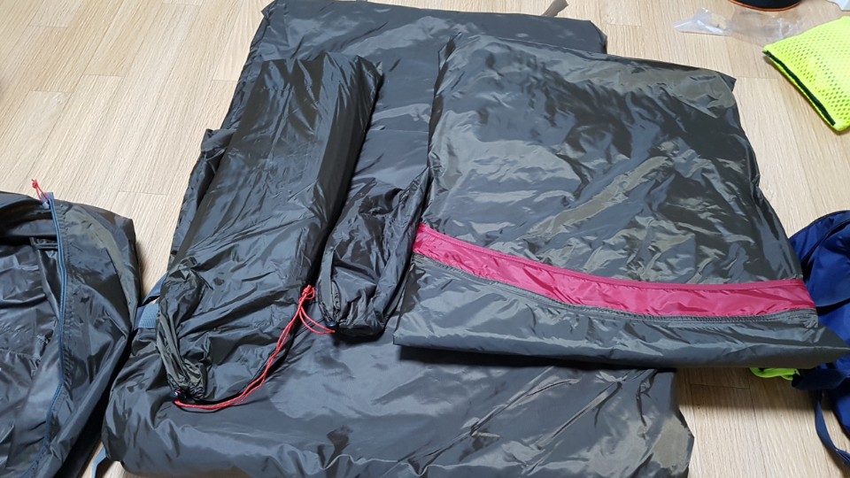 텐트 본체에 플라이랑 폴대, 팩가방이 쌓여있습니다.