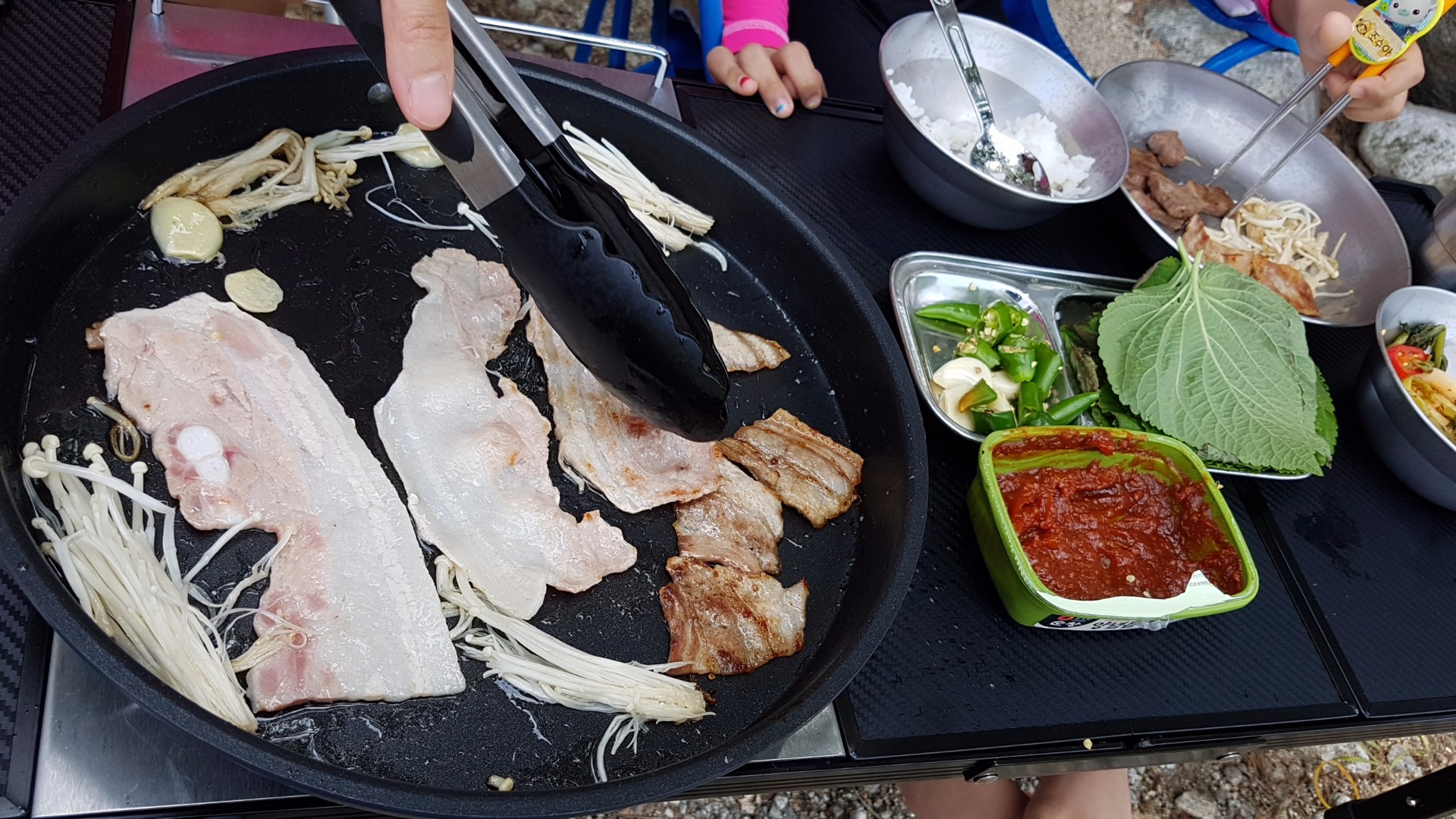 물놀이하고 지금은 배고파서 괴기에 맥쥬를