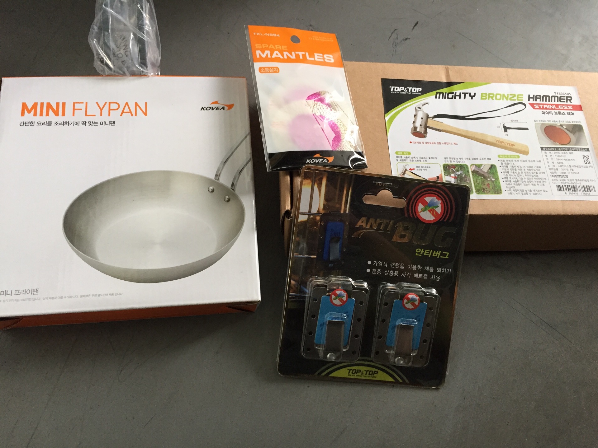 코베아 미니 프라이팬,탑앤탑 동망치,탑앤탑 안티버그,가스랜턴 심지,그리고 사진엔 없는데 자전거 타이어랑튜브까지 3만원 결제 했어요