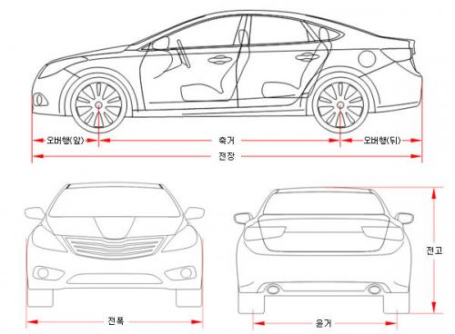 자동차의 외관 치수를 표시하기 위하여 전장, 전폭, 전고가 있고, 축거와 윤거 등이 함께 표시된다.- 전장(全長, overall length)